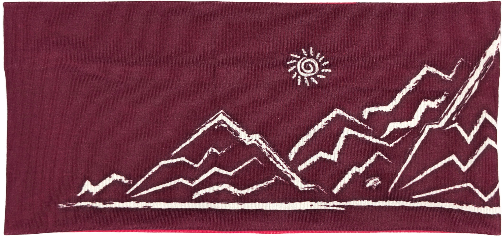 Dieses Stirnband kombiniert ein dunkles Beeren-Bordeaux mit einem diagonalen Einsatz in kräftigem Pink. Die cremefarbene, skizzenhafte Berglandschaft mit kleiner Sonne und einem Steinbock auf einem der Gipfel verleiht ihm einen lebendigen, alpinen Look.