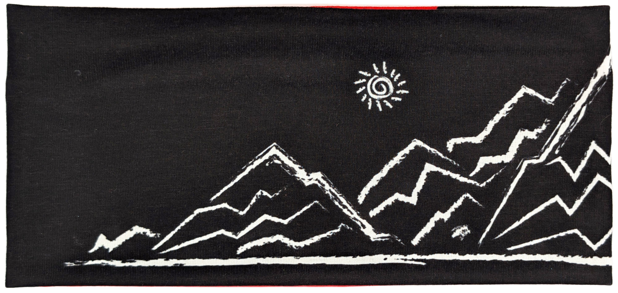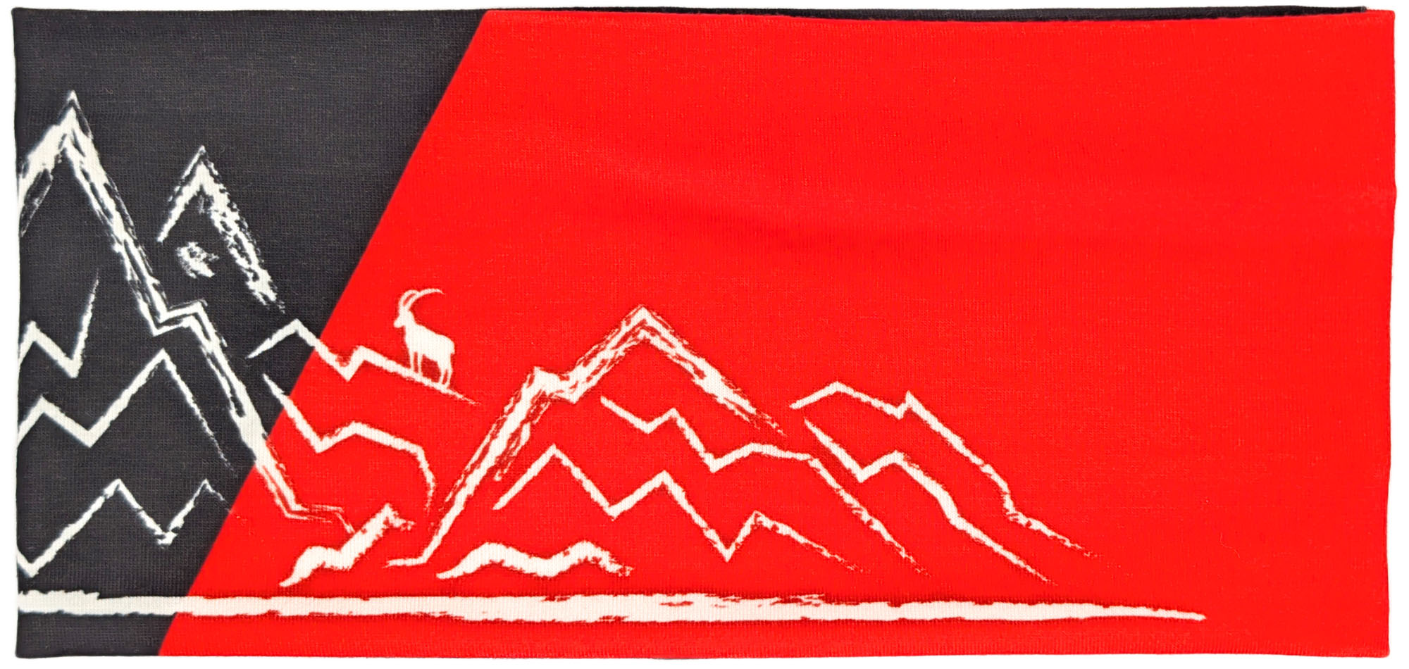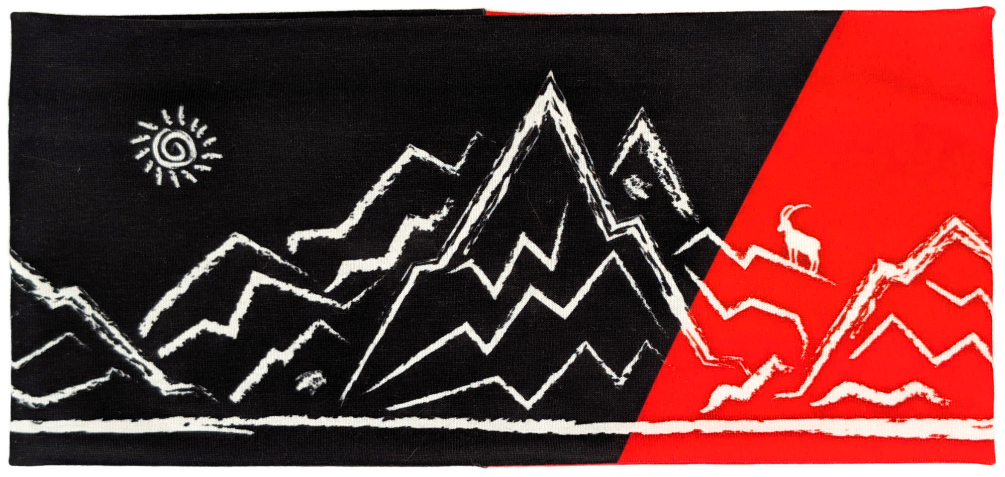 Dieses Stirnband kombiniert tiefes Schwarz mit einem diagonalen Einsatz in leuchtendem Signalrot. Die cremefarbene, skizzenhafte Berglandschaft mit kleiner Sonne und einem Steinbock auf einem der Gipfel sorgt für einen ausdrucksstarken, alpinen Look.