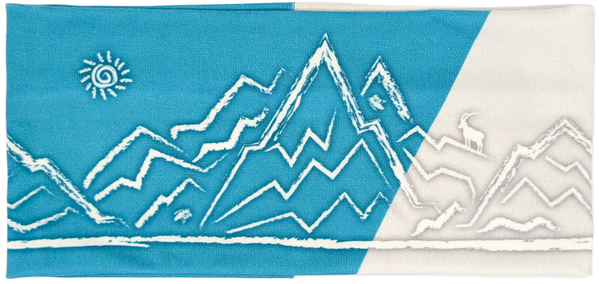 Dieses Stirnband kombiniert frisches Türkisblau mit einem diagonalen Einsatz in sehr hellem Grau. Die cremefarbene, skizzenhafte Berglandschaft mit kleiner Sonne und einem Steinbock auf einem der Gipfel sorgt für einen klaren, alpinen Look.