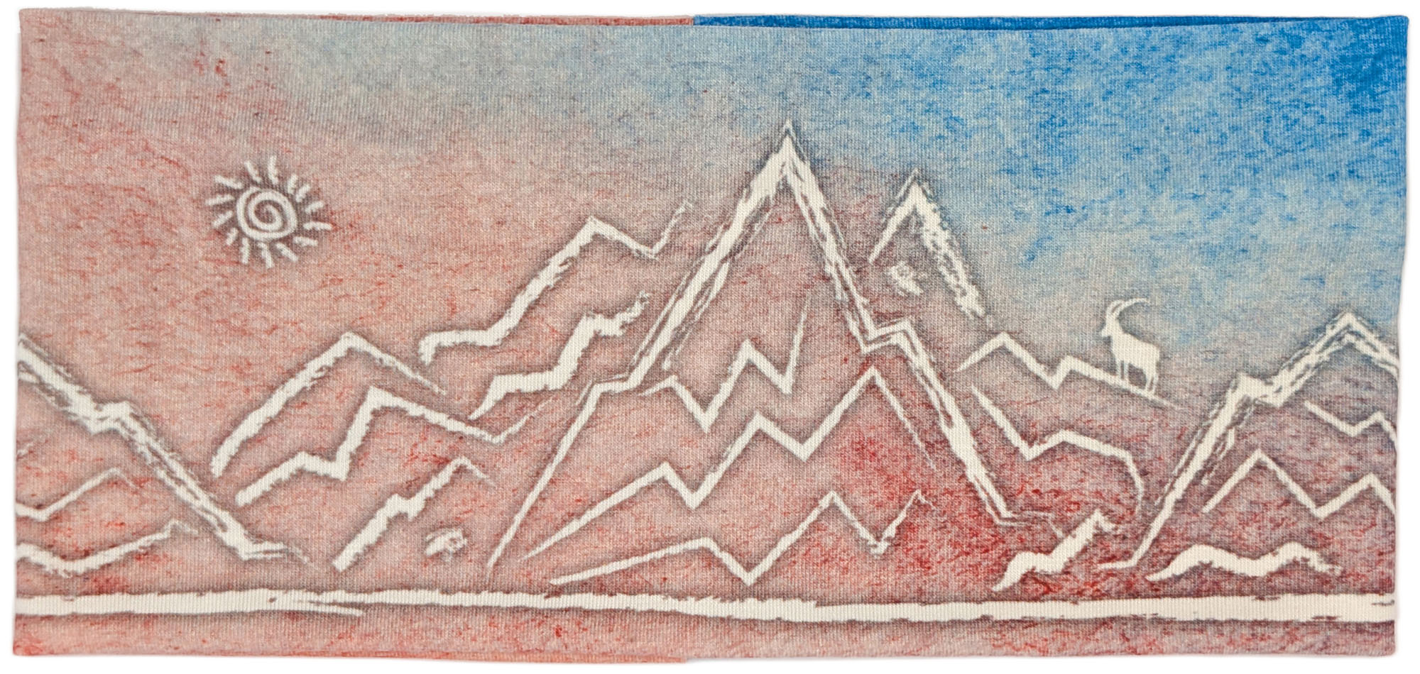 Dieses elastische Stirnband zeigt ein handgezeichnetes Bergpanorama mit Sonne und Steinbock – auf einem sanften Farbverlauf in Rosé/Beige und Blau. Angenehm zu tragen und ideal für Wanderungen, Skitouren, Laufen oder als wärmender Begleiter im Alltag.