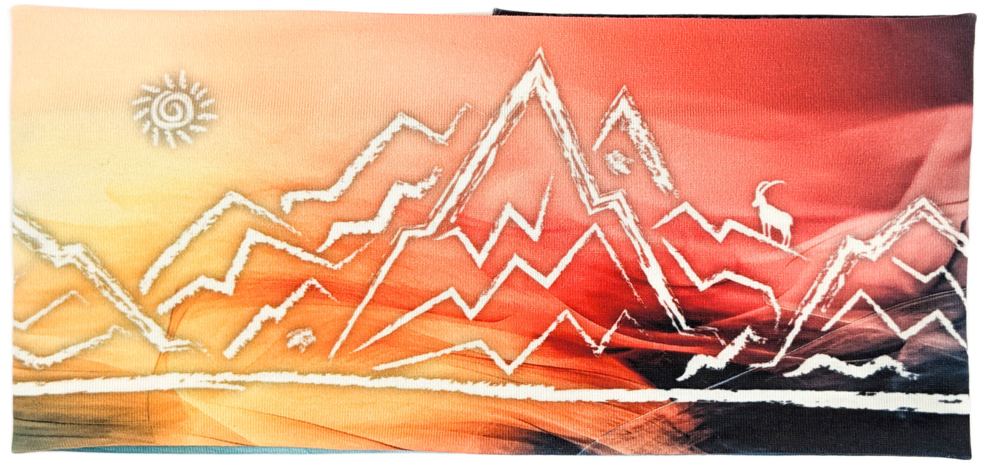 Warme Orange- und Rottöne wie beim Sonnenuntergang lassen die handgezeichnete Bergkulisse mit Sonne und Steinbock strahlen. Ein alpines Design voller Wärme und Abenteuer – perfekt für alle, die Berge im Herzen tragen.