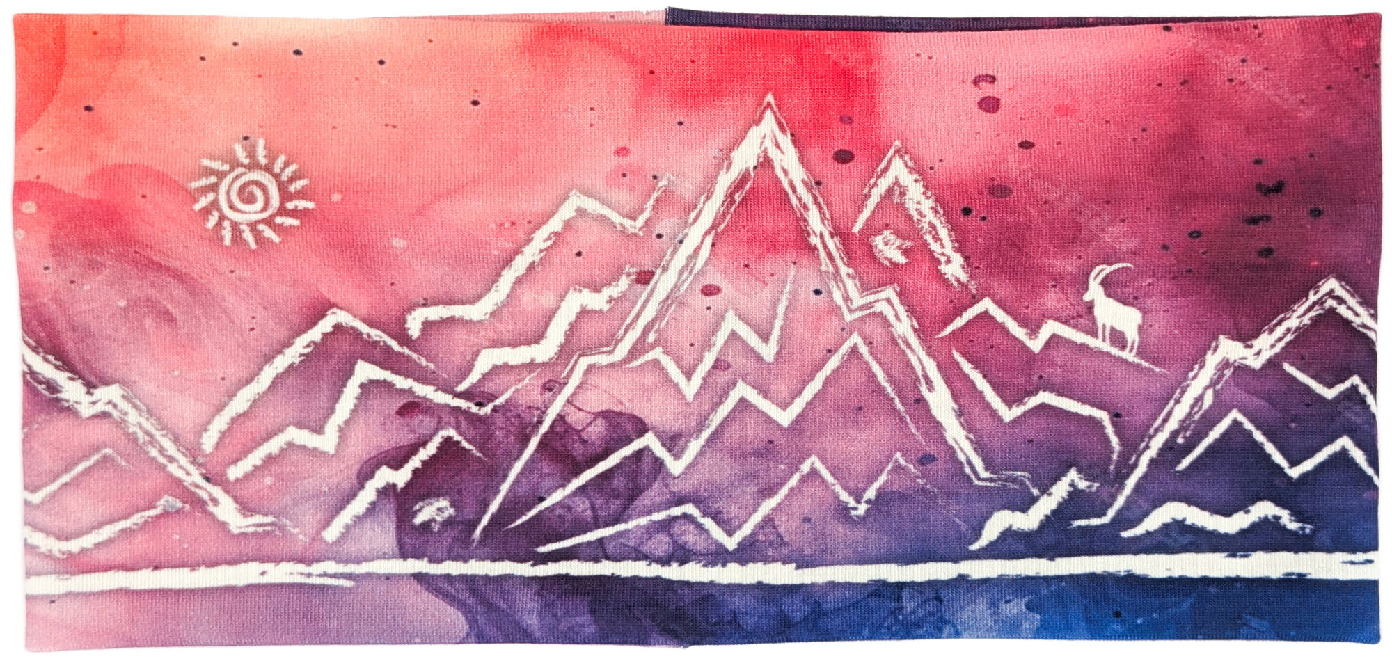 Handgezeichnete Bergkulisse mit Sonne und Steinbock – alpin, schlicht und voller Charakter. Der Aquarell-Farbverlauf in Rot-Violett-Blau macht das Design lebendig und einzigartig.